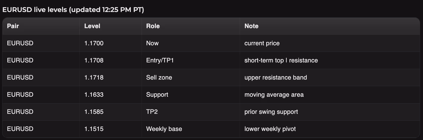 EURUSD is pressing higher and will tag nearby resistance first, then pause. My real‑time data shows price at 1.17 (+0.12%) updated 12:21 PM PT. Upside magnets sit near 1.1708 and 1.1718; first real support is 1.1633.