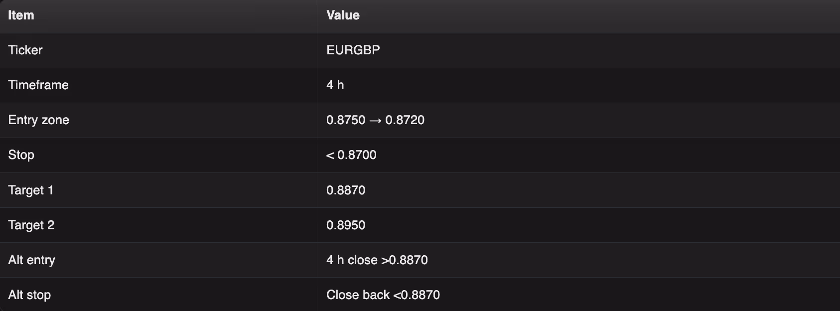 Buy the dip 0.8750–0.8720. Stop under 0.8700. Target 0.8870–0.8950. Buyers will step in near 0.8750. A strong 4‑hour close over 0.8870 will extend the push. A 4‑hour close under 0.8720 ends the idea. Take some gains at 0.8870, then let the rest run.