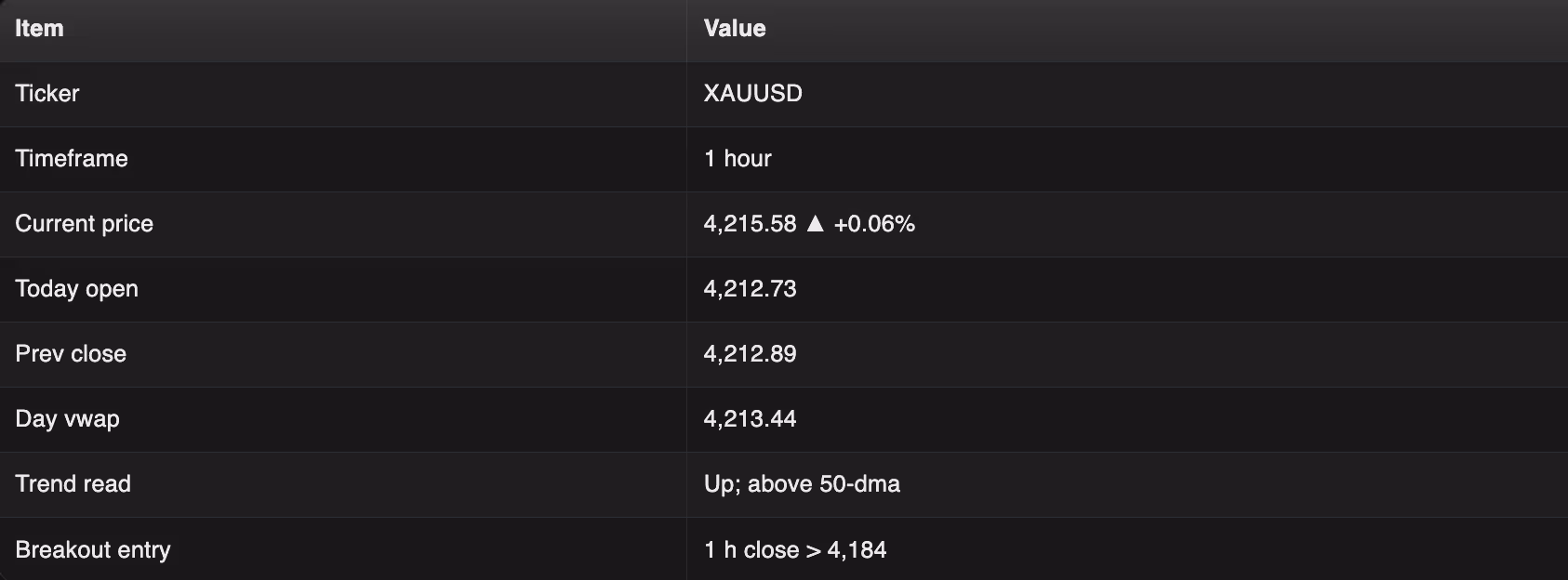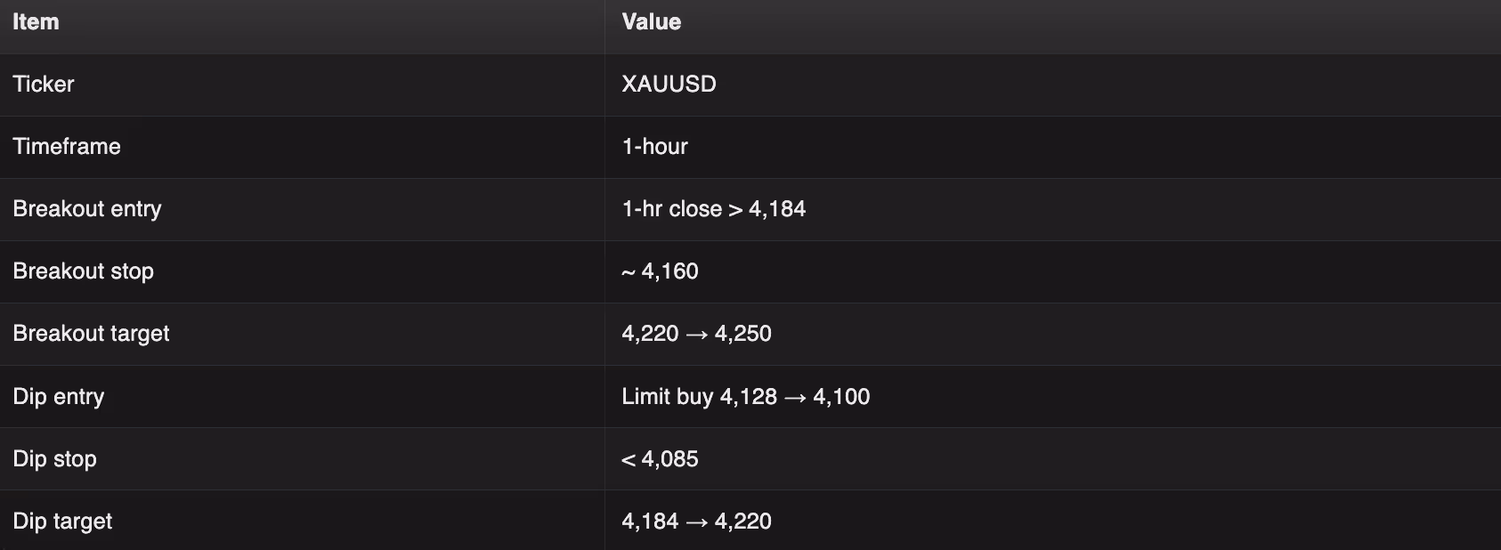 - For breakout: wait for a 1‑hour candle close above 4,184. Place buy order just above close. Put stop ~4,160. Take partial profit at 4,220 and trail to 4,250.